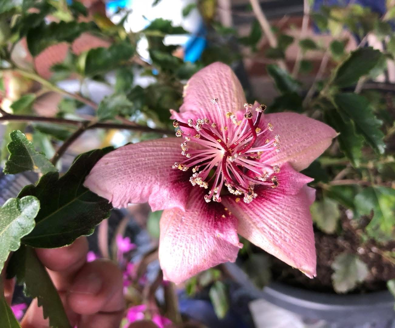 It is very rarely offered in nurseries. But is just as easy to grow as other hibiscus. And it makes the most amazing hedge! It has very small leaves and small flowers which add to its density and hedging appeal. But it also makes the most fantastic pot specimen with its little leaves and flowers giving a perfectly balanced plant. The flowers start green and burgundy, and change to pink as they age. And it flowers profusely from October to May!