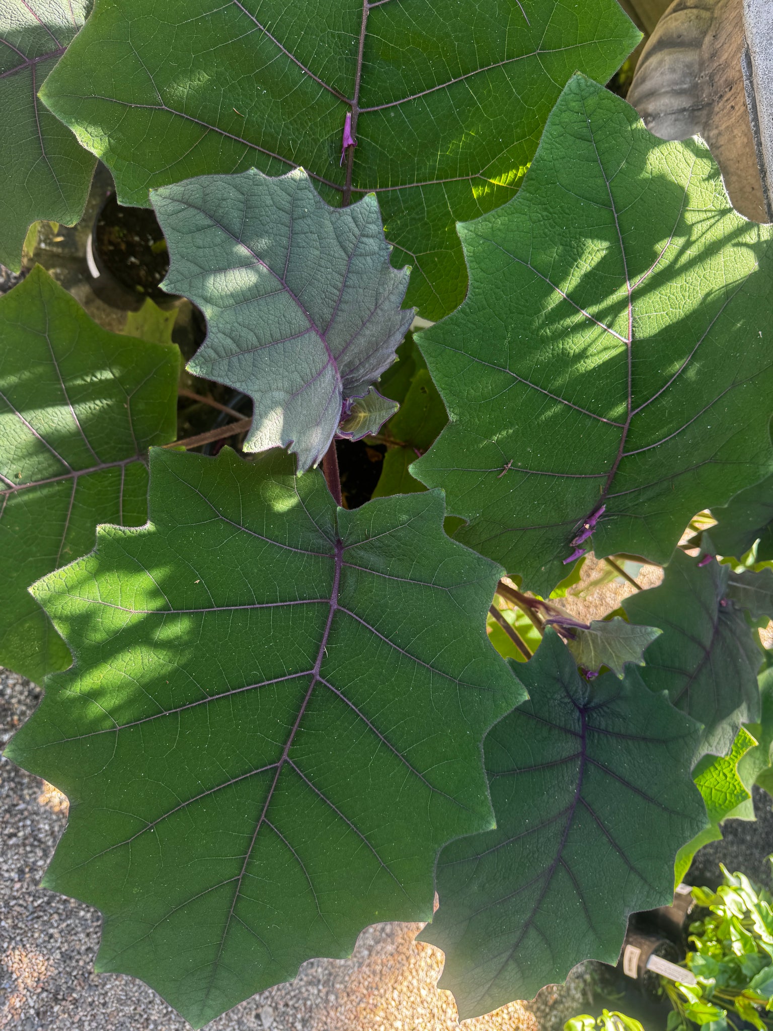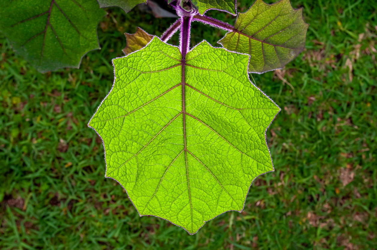 These plants are related to eggplants and tomatoes, featuring large, velvety purple-tinged leaves with a dramatic, tropical appearance. They need to be protected from frosts. And will grow 1-3m tall. They can be pruned to keep them shorter. And thrive in part shade, dappled shade, or morning sun.